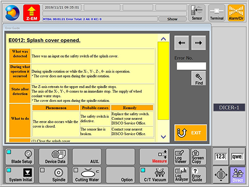 新型非接触式测高功能(Non-Contact Setup/ 选配),比较于对工作台的刀片测高时间缩短了74%。而且因测量精度的提高使加工品质更加稳定。除此之外,显微镜环形照明的开灯方向可以切换3种模式,提高了切痕检测的识别率。还可对应SECS/GEM通信系统。