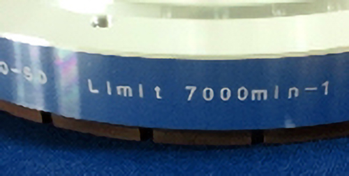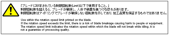 When blades and wheels (precision processing tooling) rotate at too high a rate when idling during equipment setup, there is a risk that they may break, thus causing injury and damage to the equipment. Please follow the speed limit* inscribed on the precision processing tooling to avoid such instances.