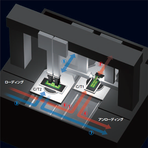 DFD6750は、生産性を大幅に向上させたダイシングエンジンです。2つのチャックテーブル(以下C/T)を搭載したDFD6750は、一方のC/Tで加工中に、他方のC/Tで搬送/アライメント/洗浄を同時におこなうことができるため、加工待機時間が大幅に短縮し、生産性が向上します。また、各軸の戻り速度を向上することで加工時間を短縮しています。