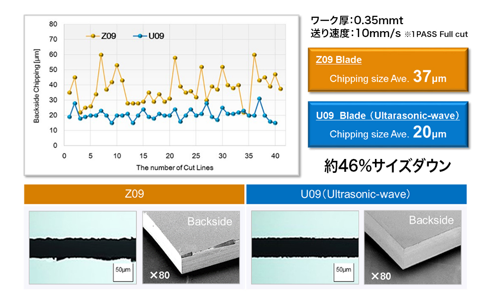 これら難削材加工におけるブレードダイシングの問題点を解決するために開発されたのが、超音波ダイシングです。