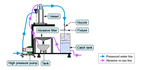 研磨材を効率よく使うため、損耗していない研磨材を水中で回収して再利用するシステムを採用しました。